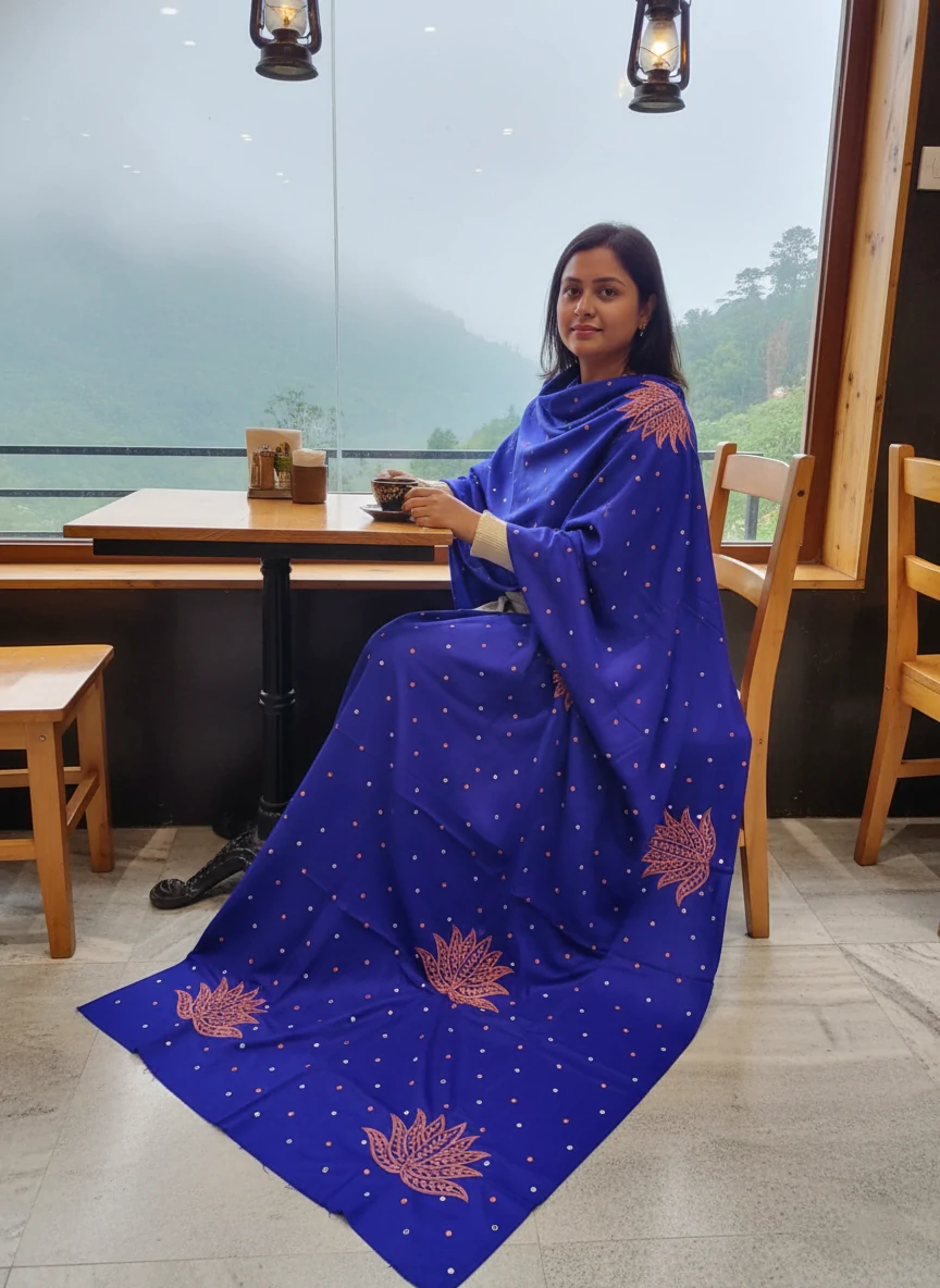 Designed in a larger, full-coverage size, it drapes beautifully — perfect for both everyday grace and special occasions. Soft, warm, and stunningly detailed, it’s more than a shawl — it’s a statement.